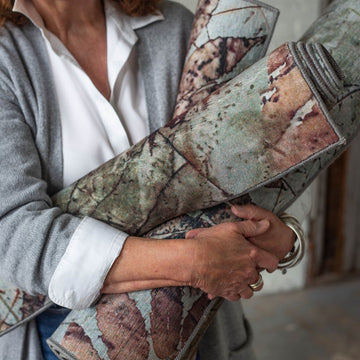 Louise Barker, owner and head of design at Louise Barker Designs, crafts unique accessories inspired by Montana's landscape. She blends sophistication and nature, drawing from her Midwestern farm upbringing that taught her resourcefulness. Embracing a tactile approach, she lets materials guide her designs to balance elegance with nature. With over 30 years in surface design, she enjoys the unexpected results from working with uncontrollable substances and processes, allowing new meanings in color and texture.