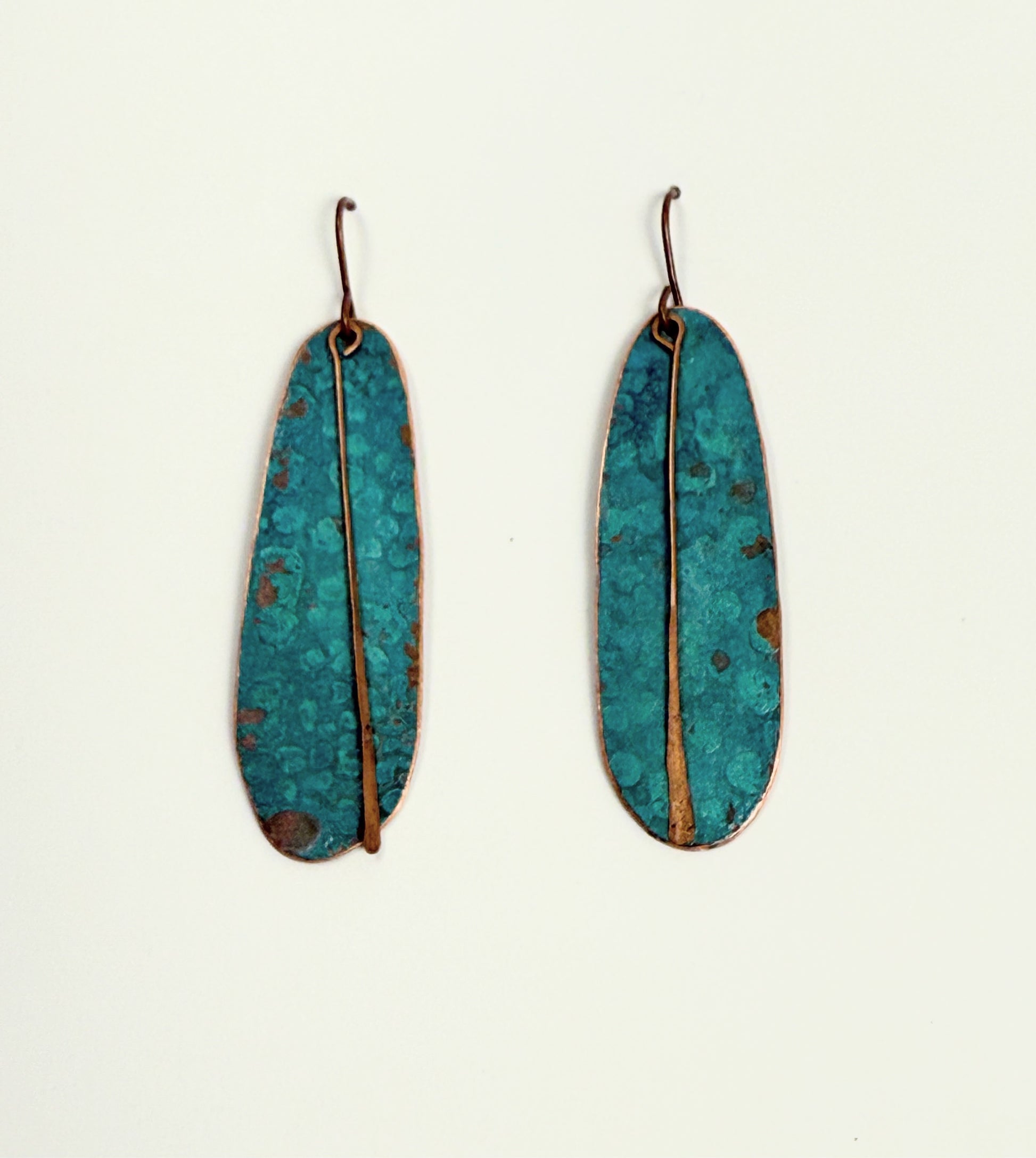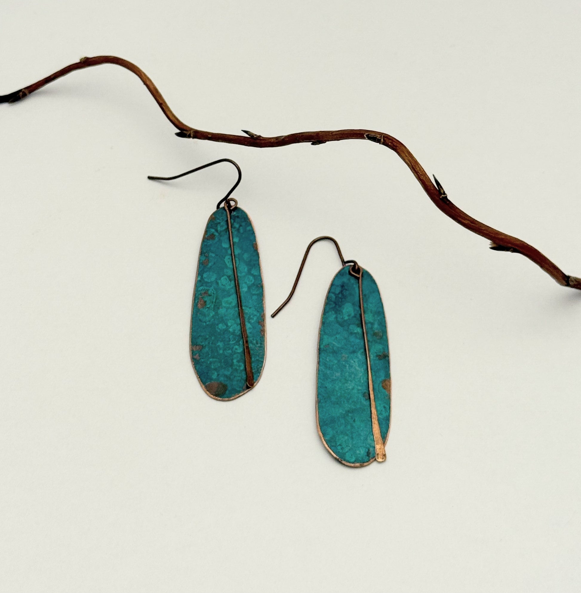 These earrings began as rescued copper, lovingly transformed through hand-cutting, sanding, texturing, and layers of patina to reveal their new personality. Inspired by a sophisticated, organic aesthetic, they’re designed to become a staple in your jewelry wardrobe. A soft turquoise patina adds a beautiful pop of color, while a thin hammered copper strip hangs freely across the front, creating subtle movement and shimmer. One-of-a-kind, lightweight, and full of character—these earrings celebrate the beauty of reinvention.