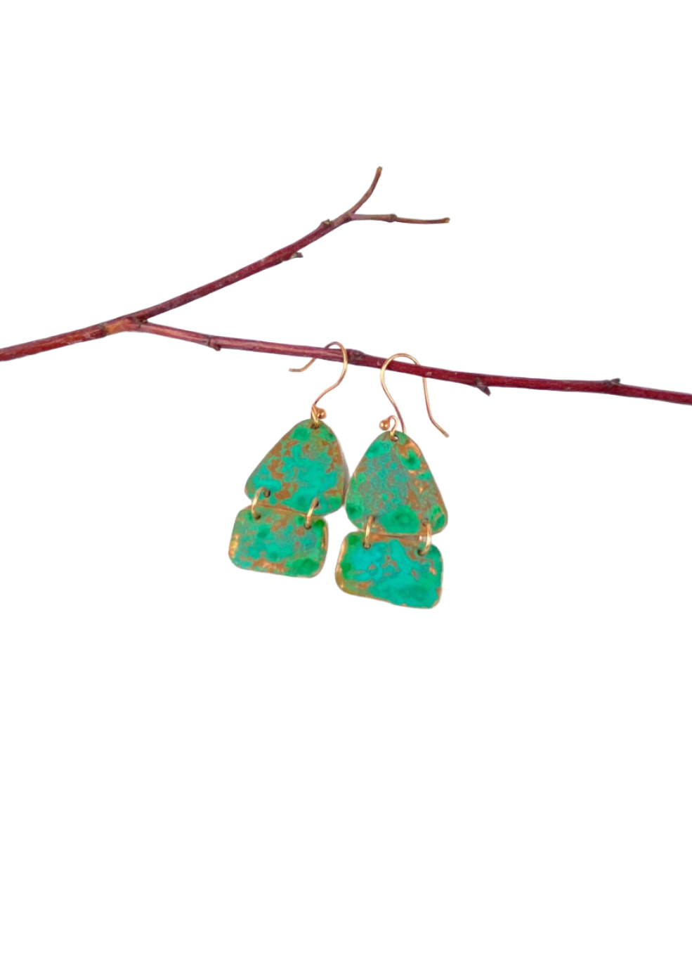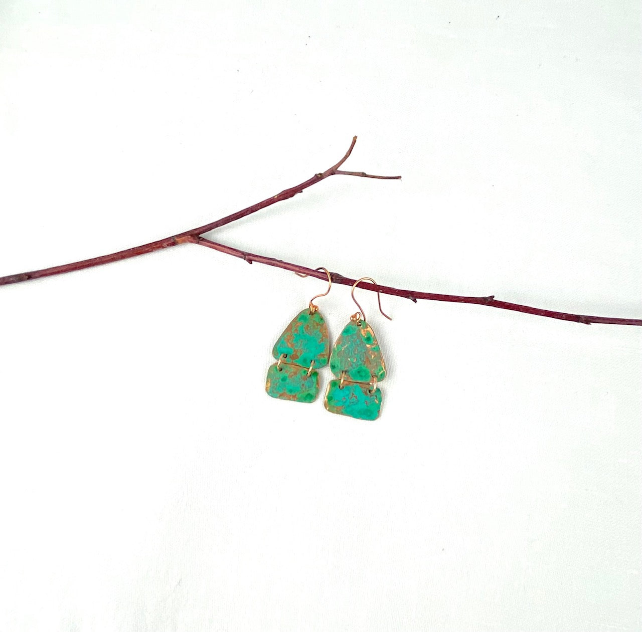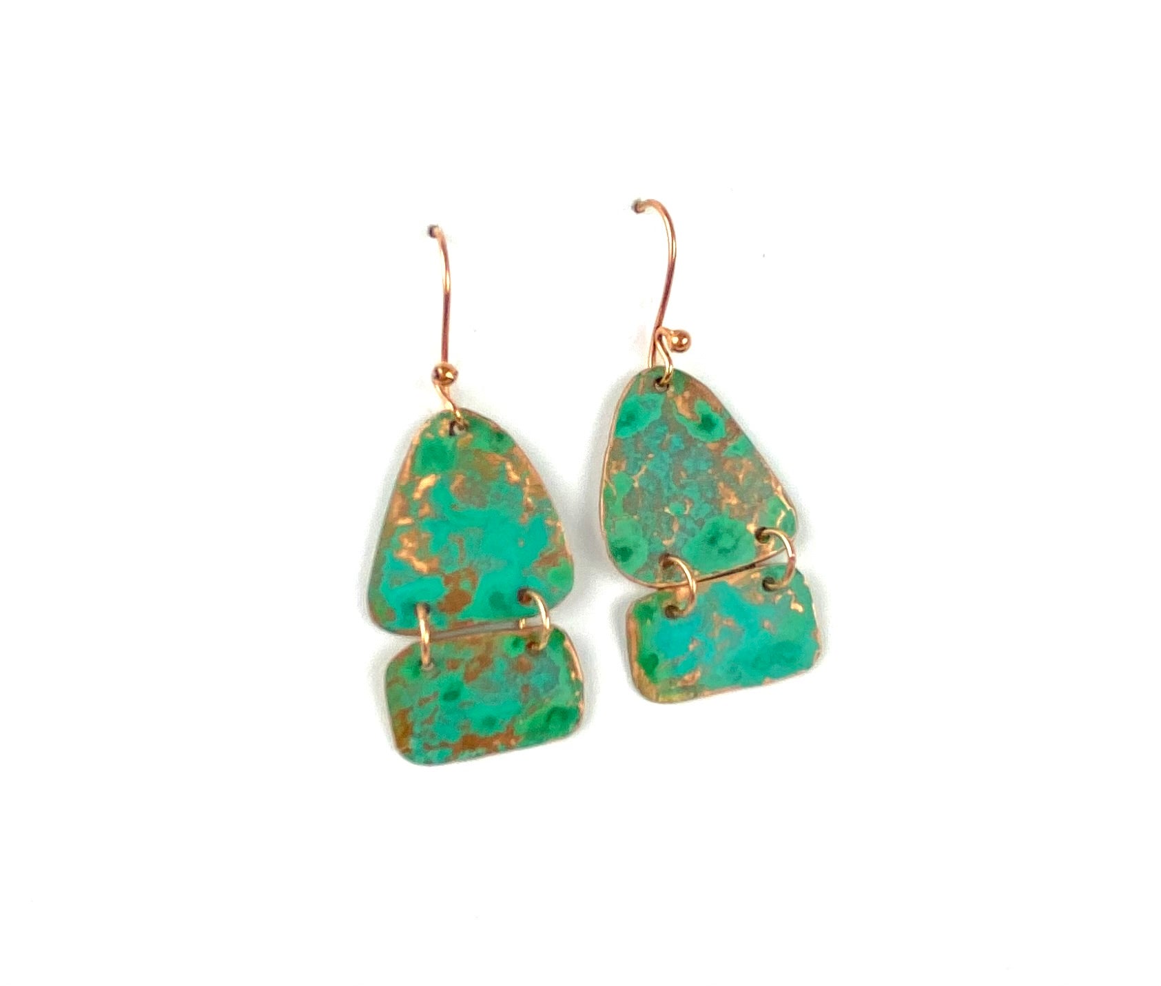 These earrings were created using recycled copper with a gorgeous turquoise blue/green patina! Hand cut, hammered and hinged earrings make a fun statement and are definitely one of a kind.