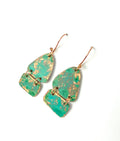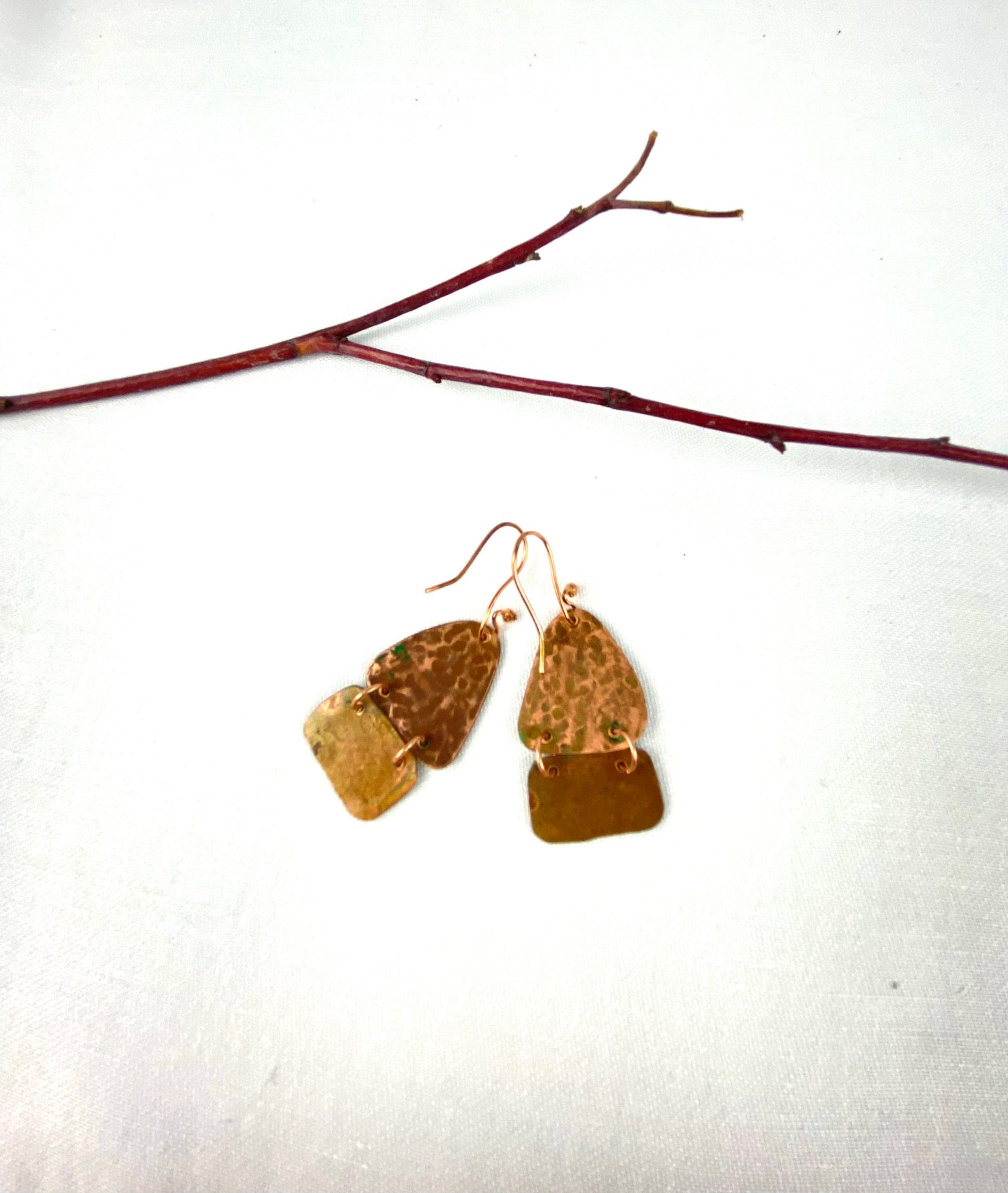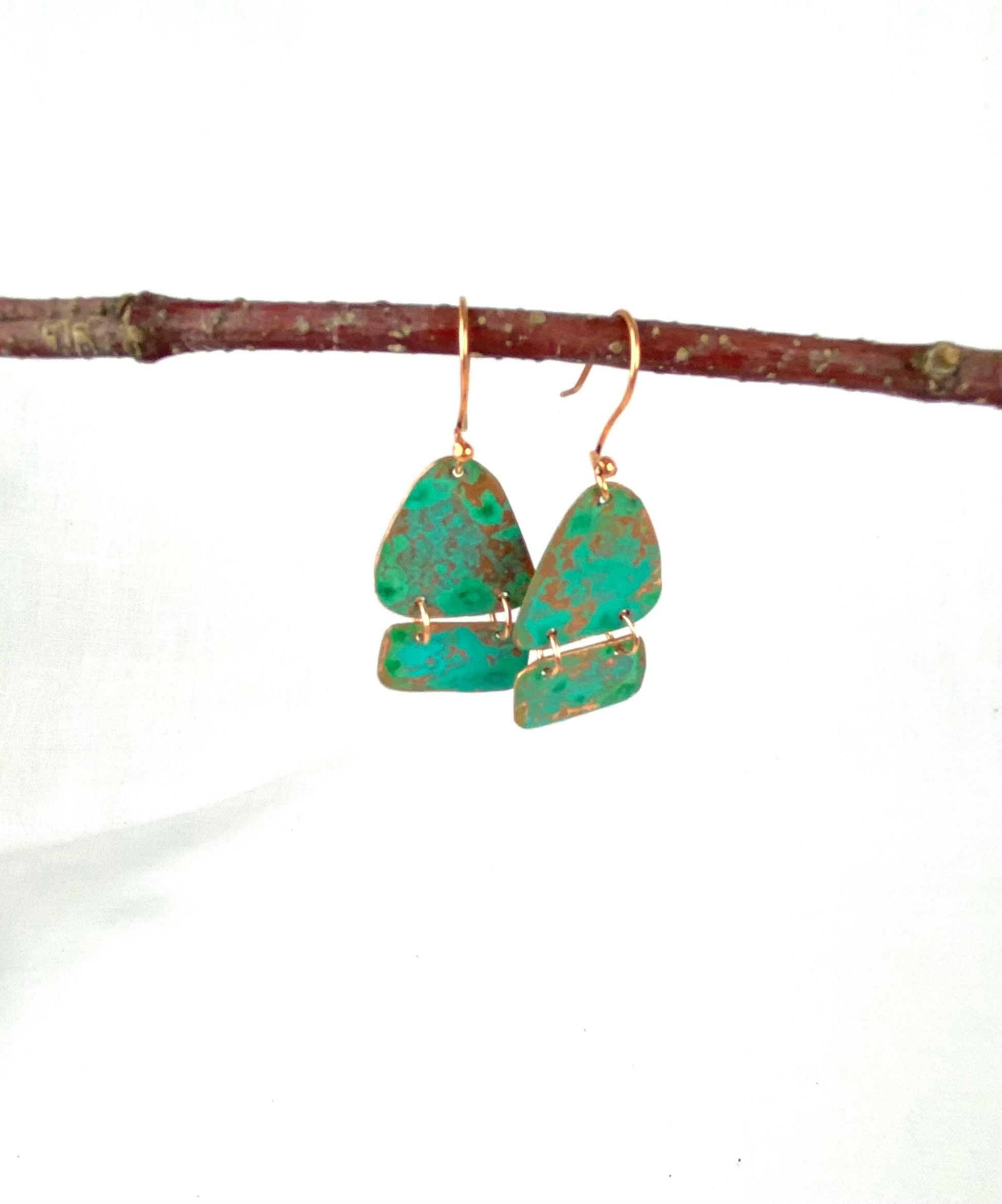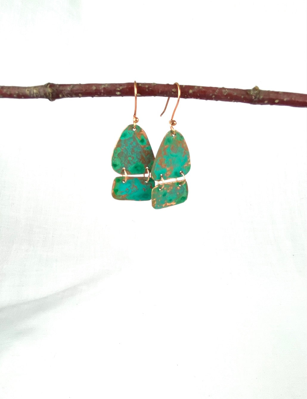 These earrings were created using recycled copper with a gorgeous turquoise blue/green patina! Hand cut, hammered and hinged earrings make a fun statement and are definitely one of a kind.