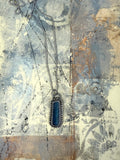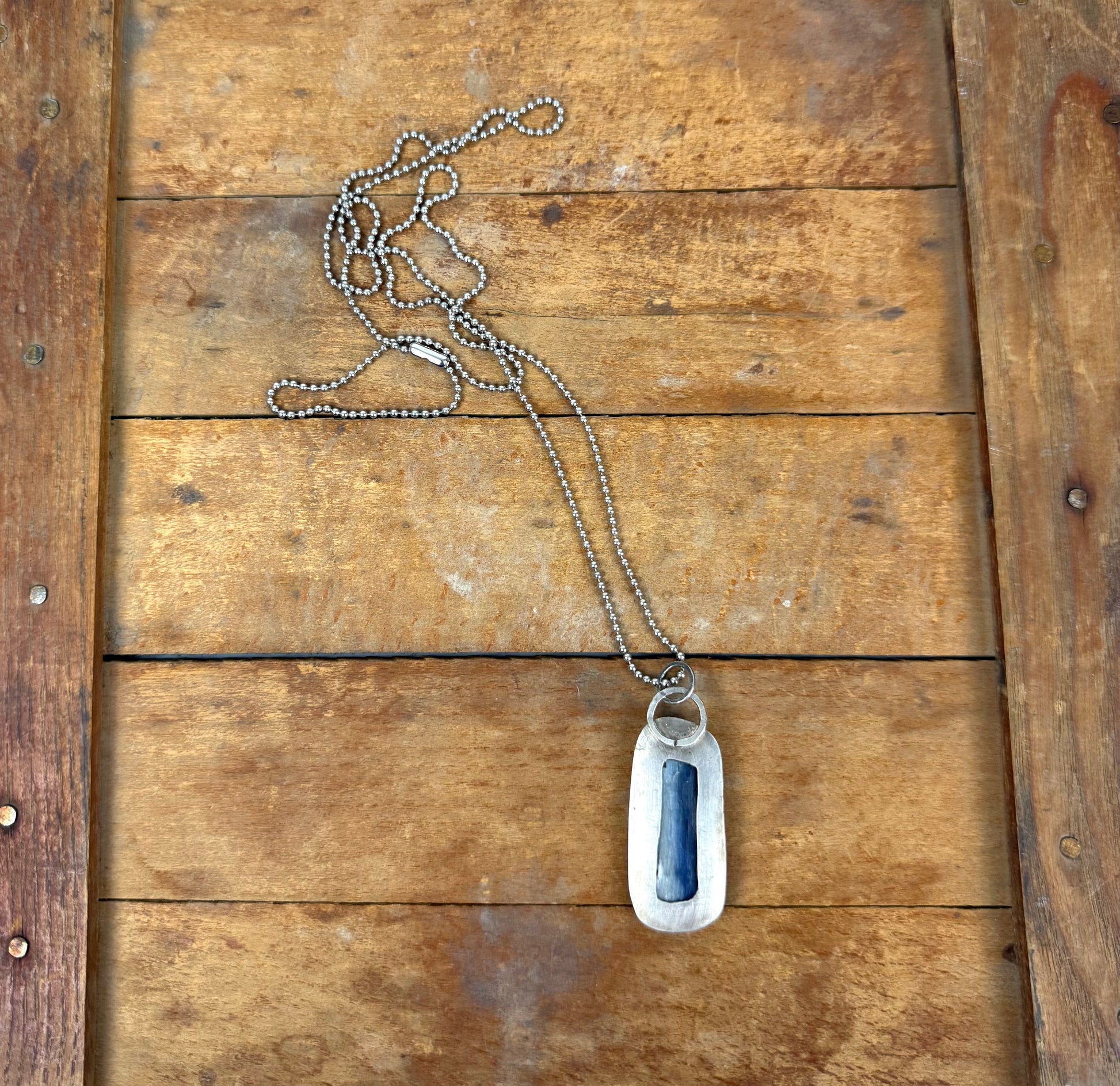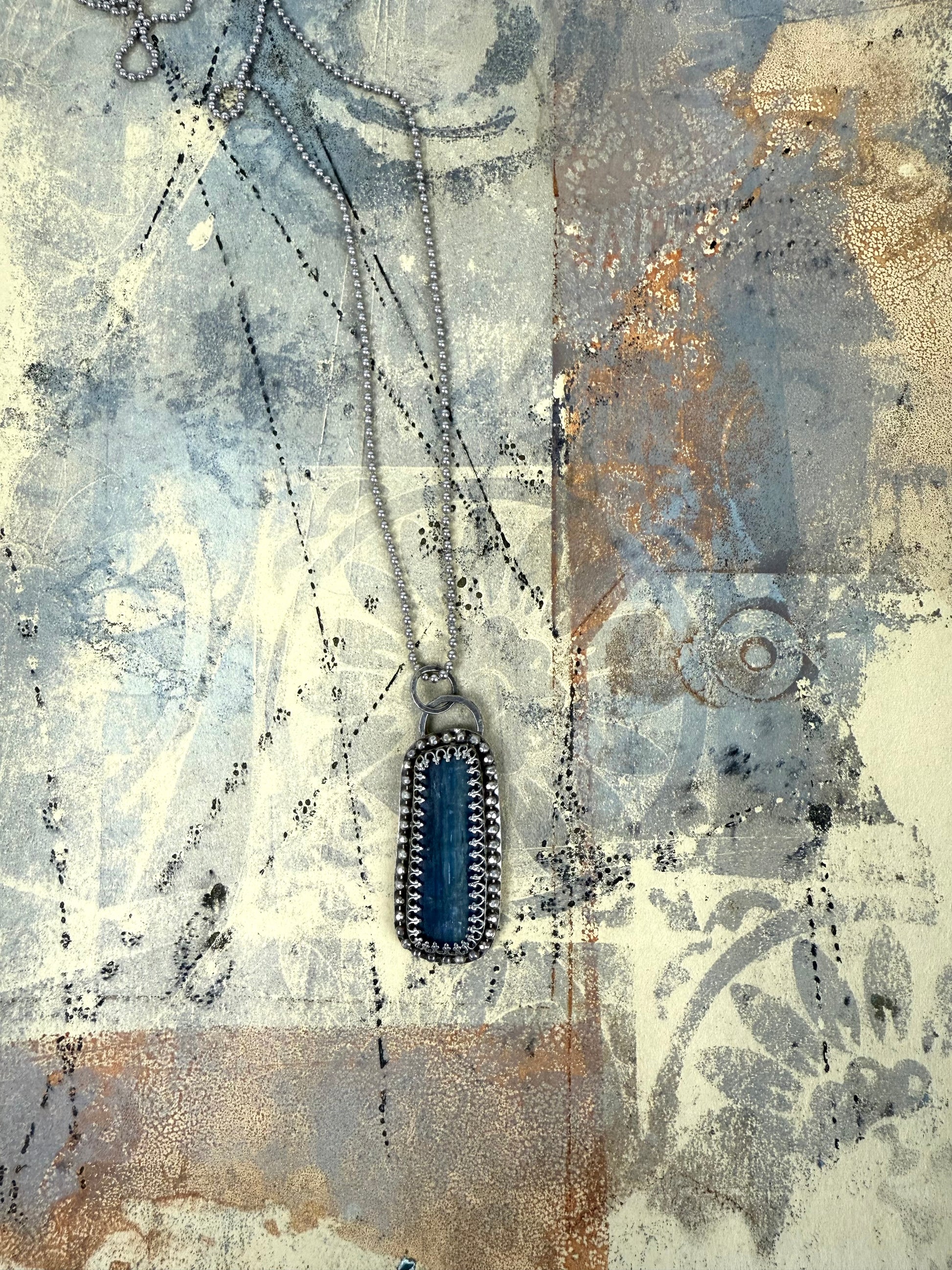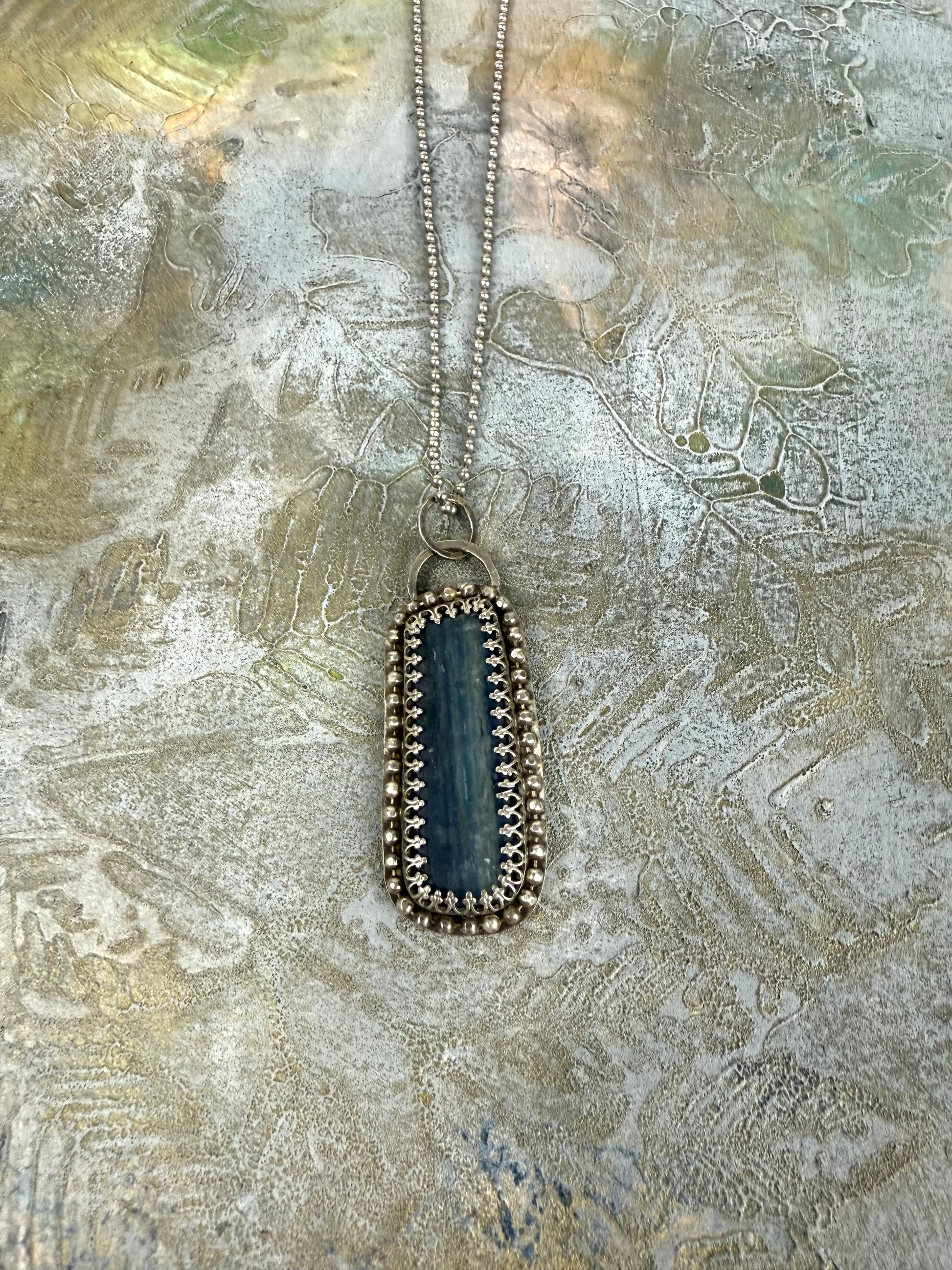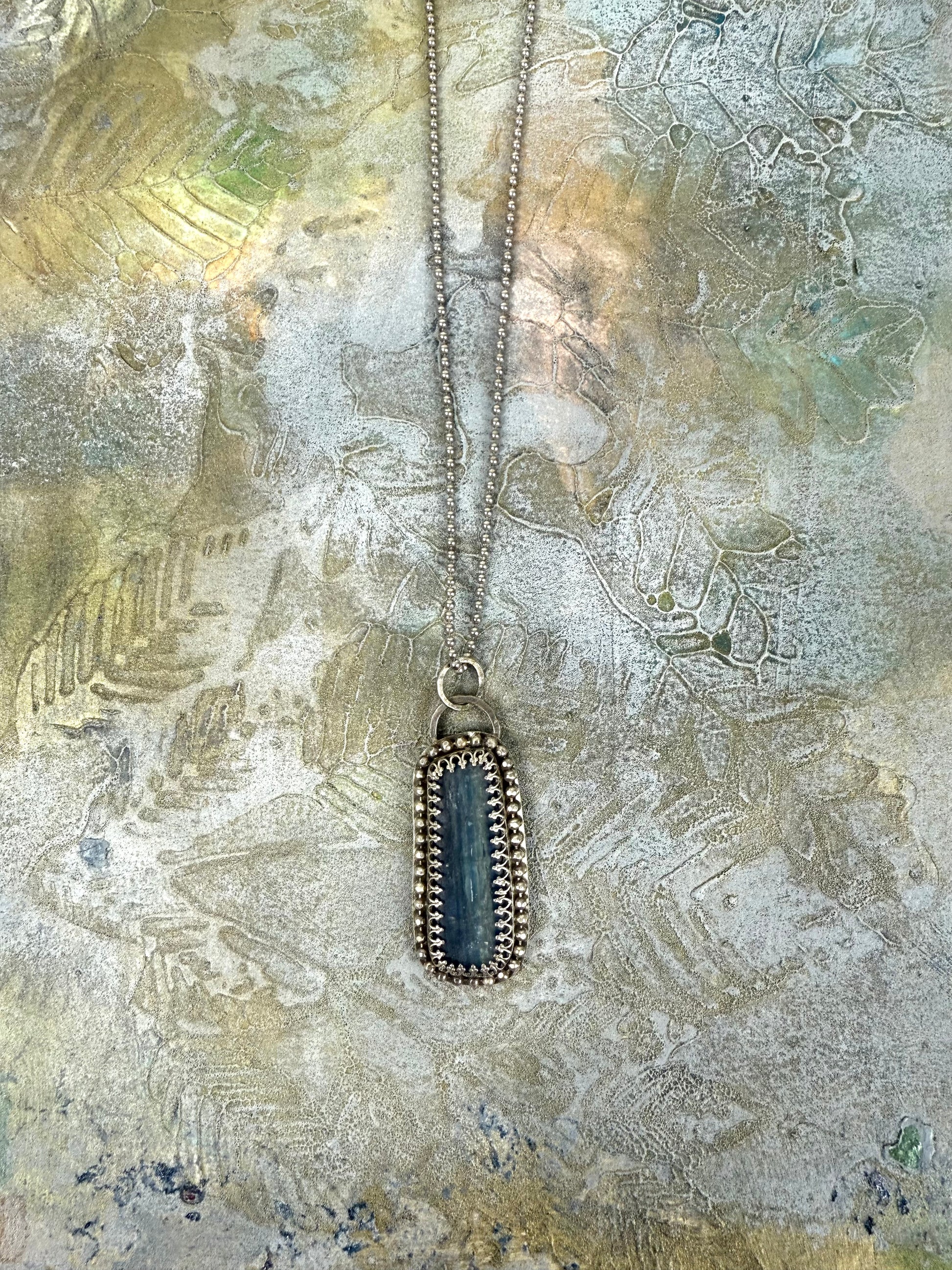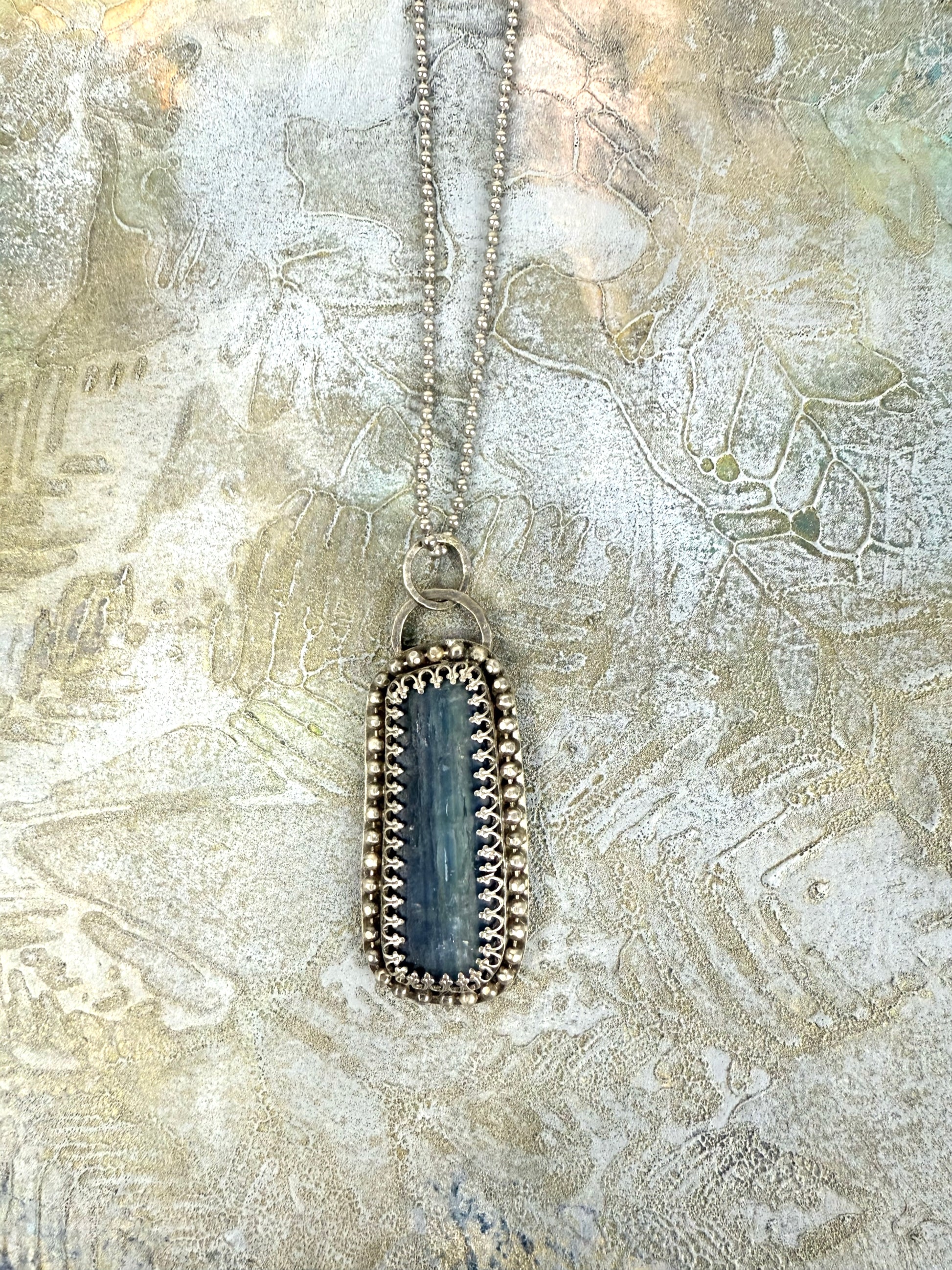 A timeless favorite, dusty blue kyanite takes center stage in this elegant silver pendant. Known for its unique variations, each kyanite stone offers its own subtle shimmer and depth. This one is encased in sterling silver with a soft gray patina, giving it a gently weathered, organic feel that complements the stone beautifully.