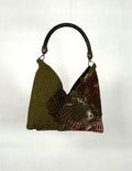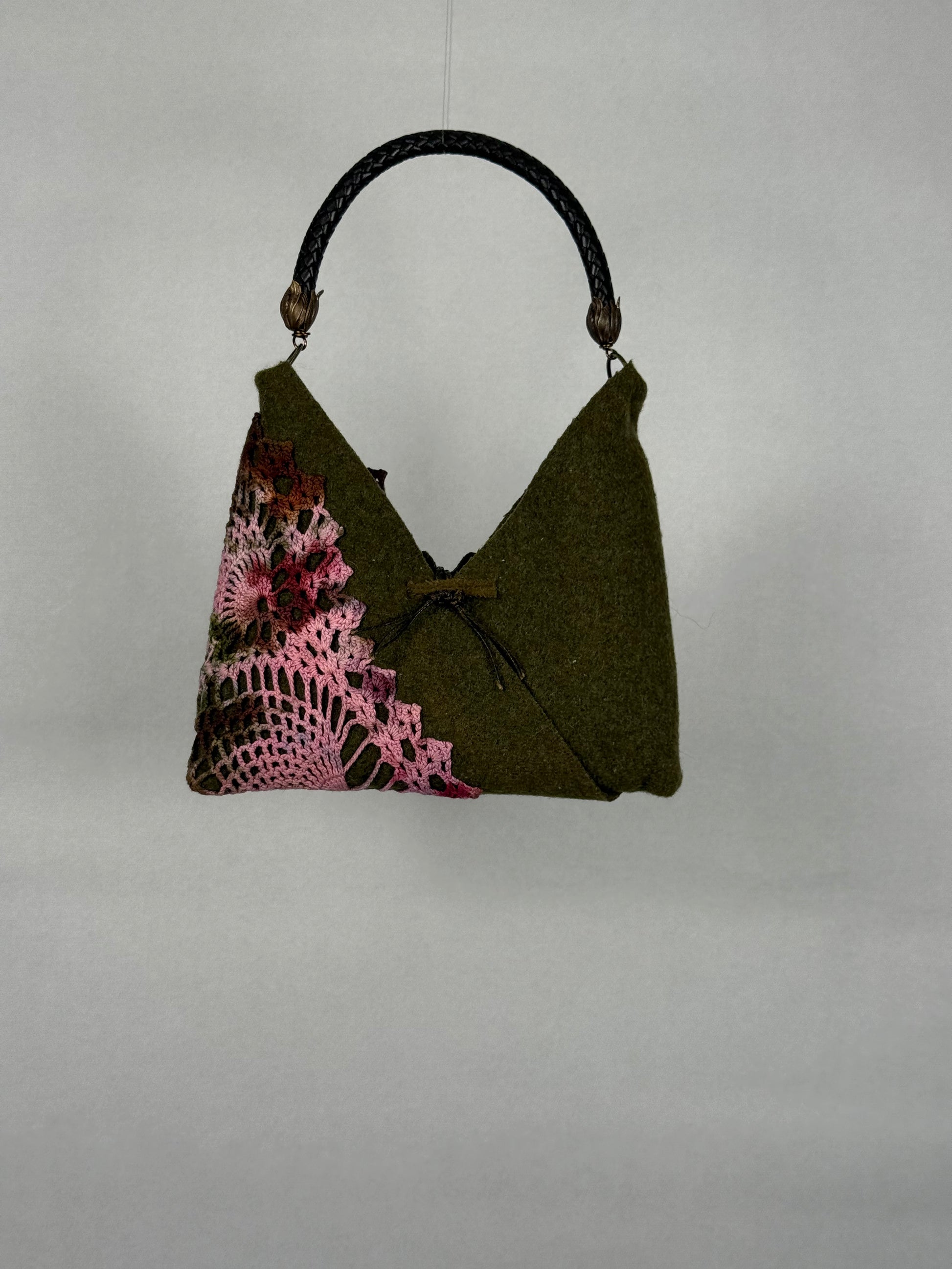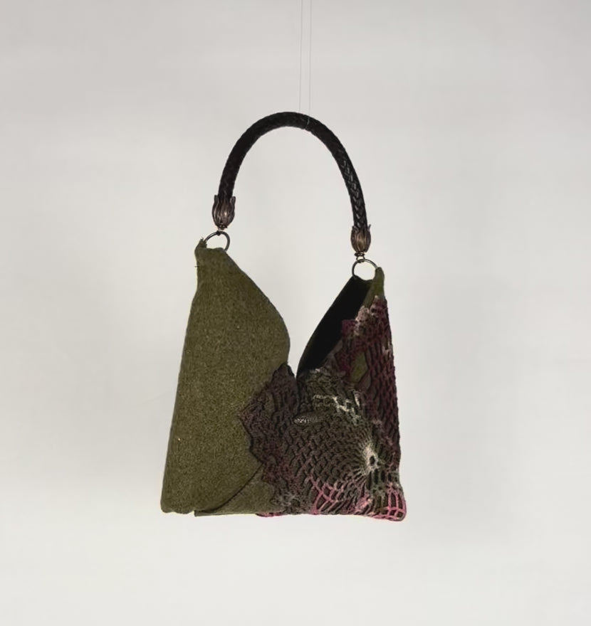 Carry a piece of history reimagined. This one-of-a-kind mini tote is crafted from a vintage hand-crocheted piece, snow-dyed for a unique backdrop, and paired with repurposed dark green wool from an old blanket. A braided leather handle with brass flower caps adds charm and strength, while a brass button and leather cord closure keep everything secure.