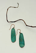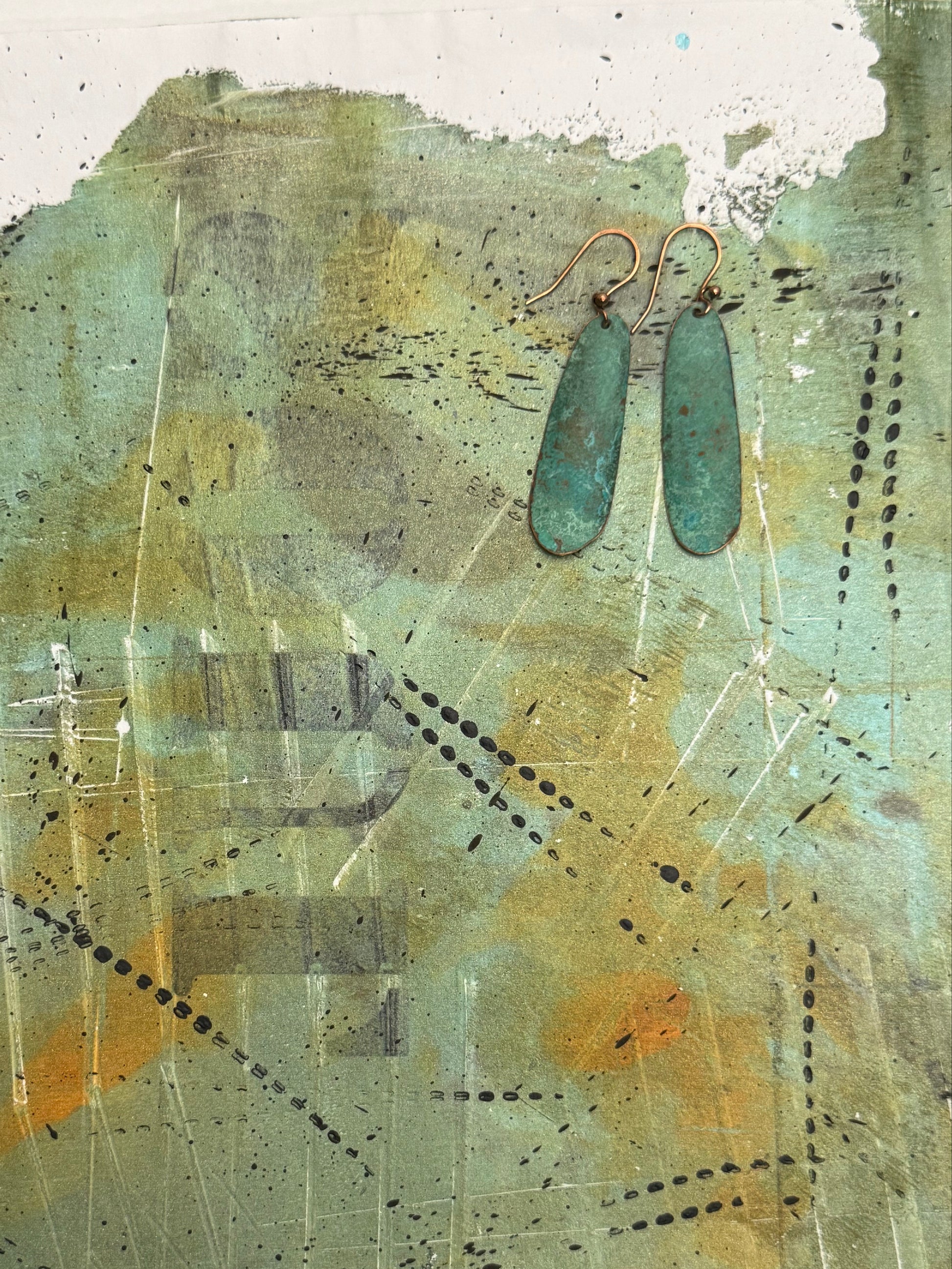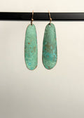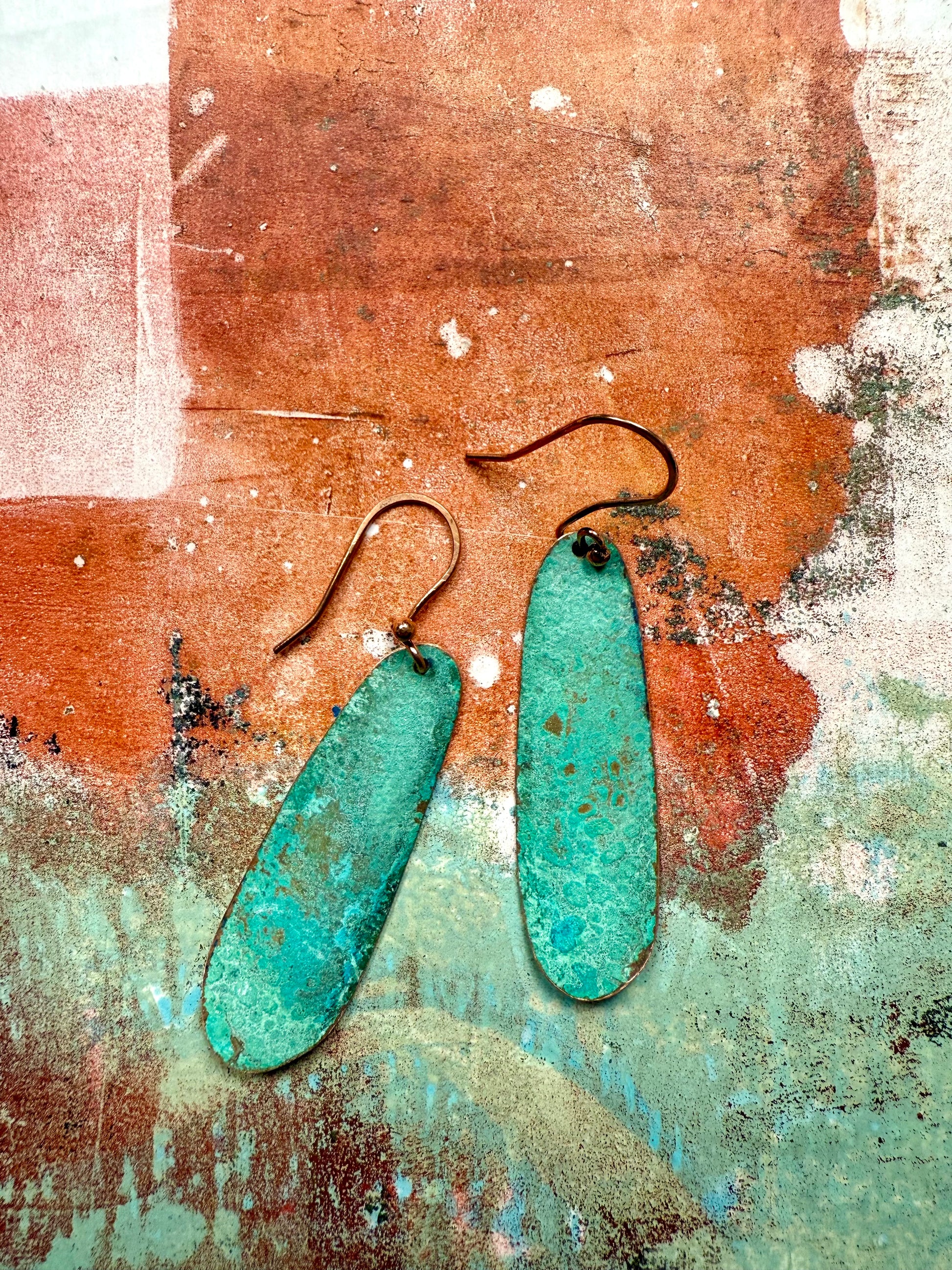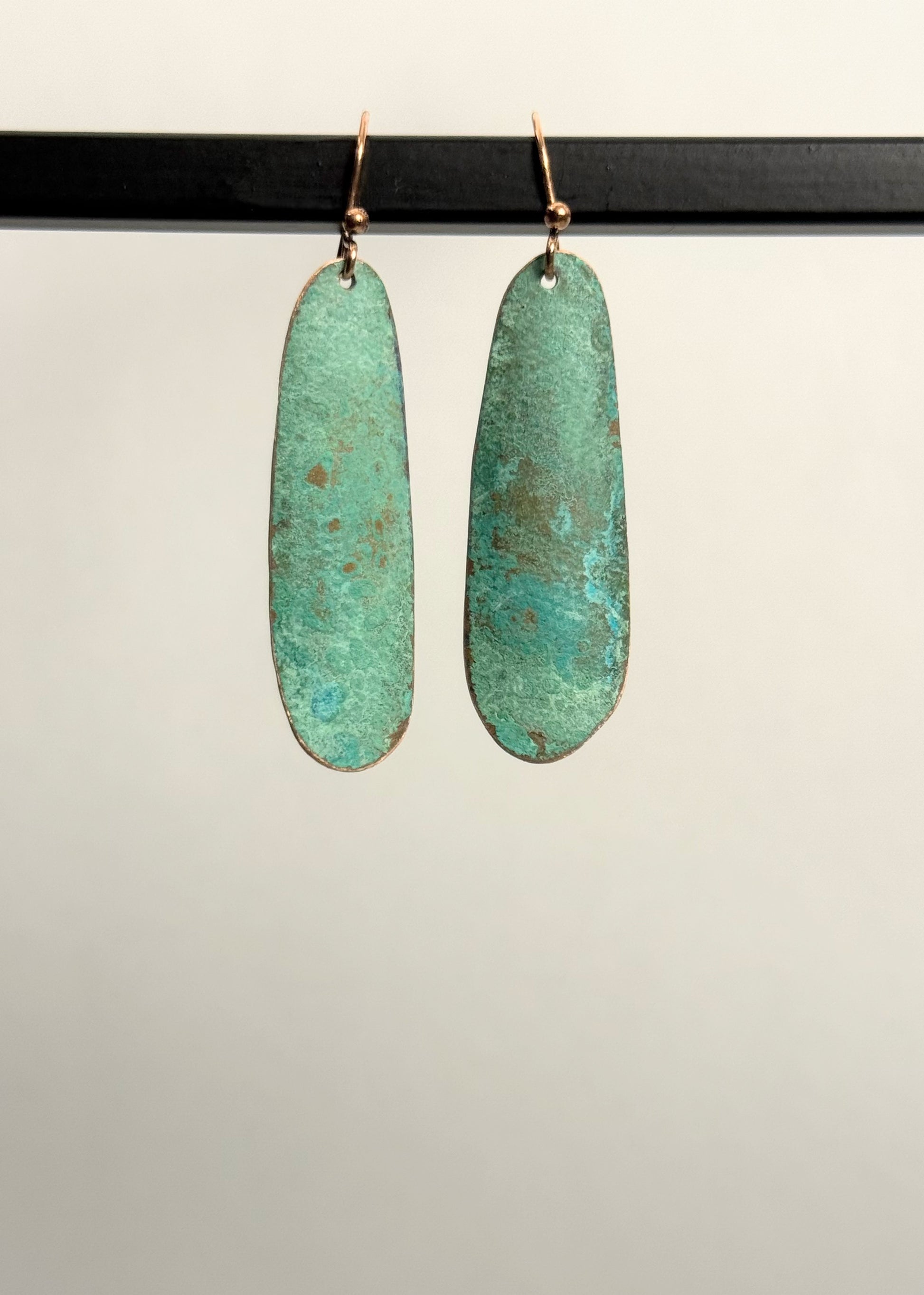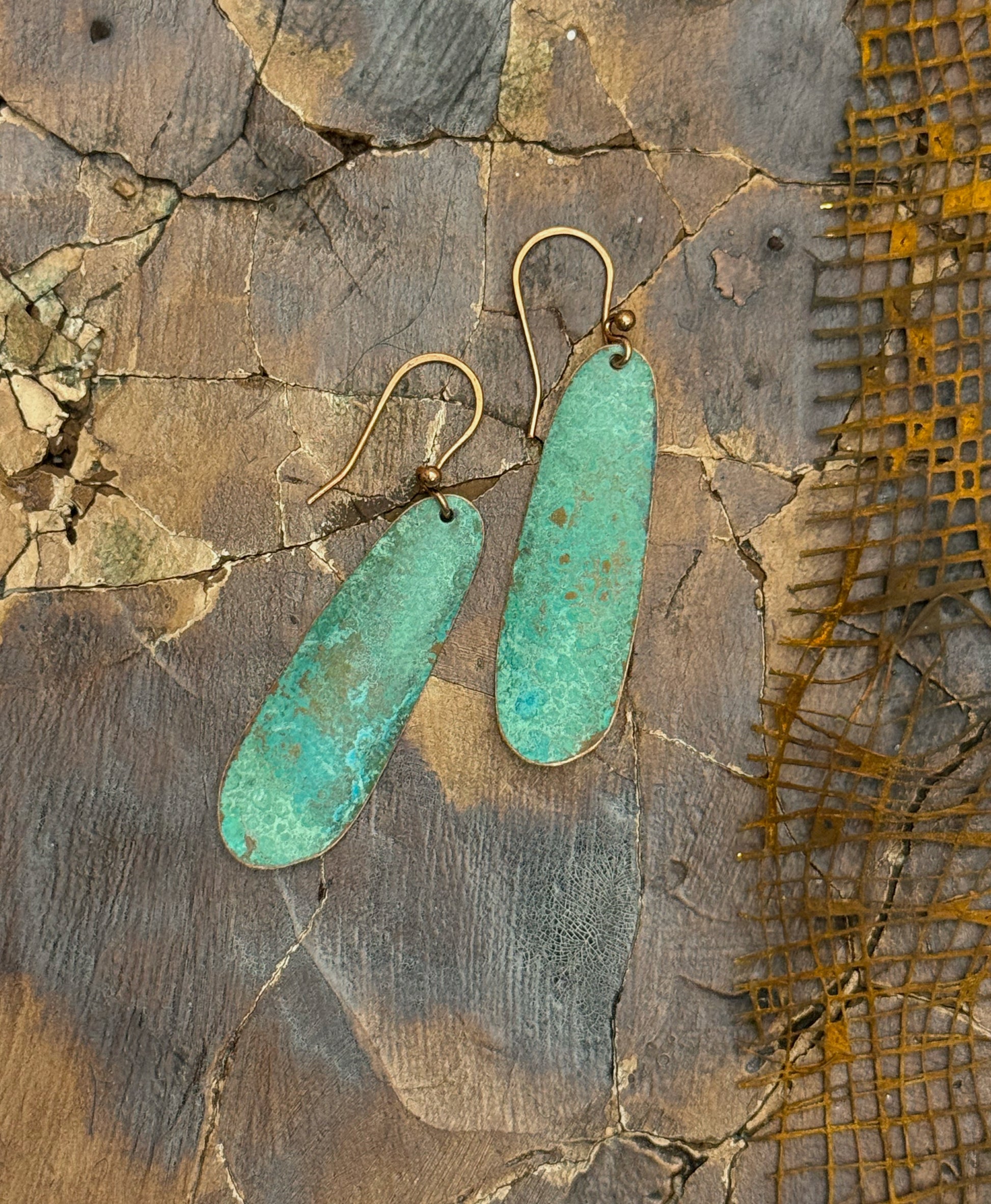Hand-crafted from recycled copper and finished with an aqua patina that develops uniquely on each pair, they embody the beauty of artisanal creation. The elegant, understated form complements many while maintaining a timeless appeal that transcends seasonal fashion cycles. A singular expression of conscious luxury.